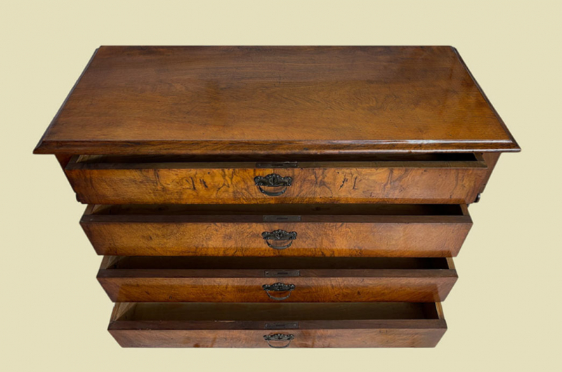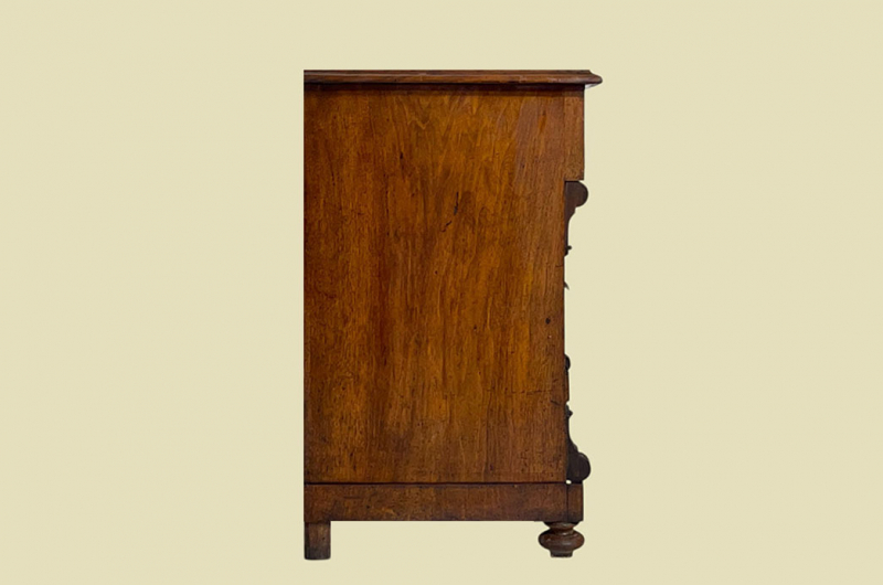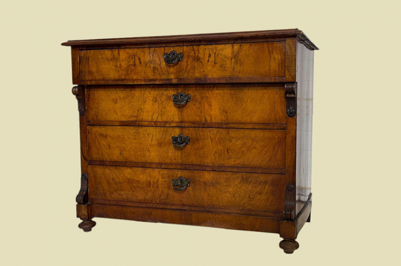 Hierbei handelt es sich um eine antike Gründerzeit 4-Schüber Kommode von 1880. Die antike Gründerzeit Kommode ist aus Nußbaum und hat eine Original Schellack Oberfläche. Die Schubladen sind fassettiert und haben schöne Nußbaum Wurzelholz Füllungen. Links und rechts neben den Schubladen der antiken Gründerzeit Kommode befinden sich gerillte Vollholz Leisten welche in geschnitzte Kapitäle übergehen. Die Schubladen sind leichtgängig zu öffnen. Die Gründerzeit Kommode hat schöne Messing Beschläge. Alle 4 Schlösser sind vorhanden. Oberhalb befindet sich eine stabile Deckplatte. Die Gründerzeit Kommode steht auf stabilen gedrechselten Vollholz Füßen. Die Kommode ist ein wahres Platzwunder, in dem jede Menge verstaut werden kann. Auf jeden Fall hat das Möbel eine ausgewogene Formgebung und ist ein Eye-Catcher in jeder gut situierten Wohnung. Das Möbel stammt aus einem tierfreien Nichtraucher Haushalt und ist ist in einem schönen wohnfertigen Zustand.