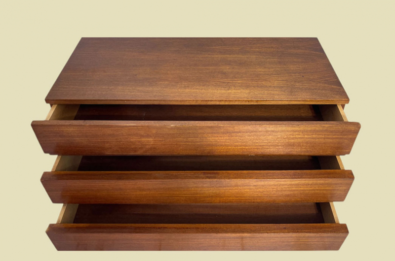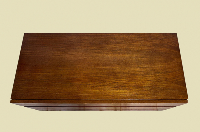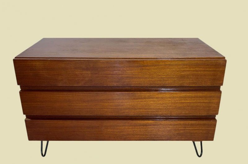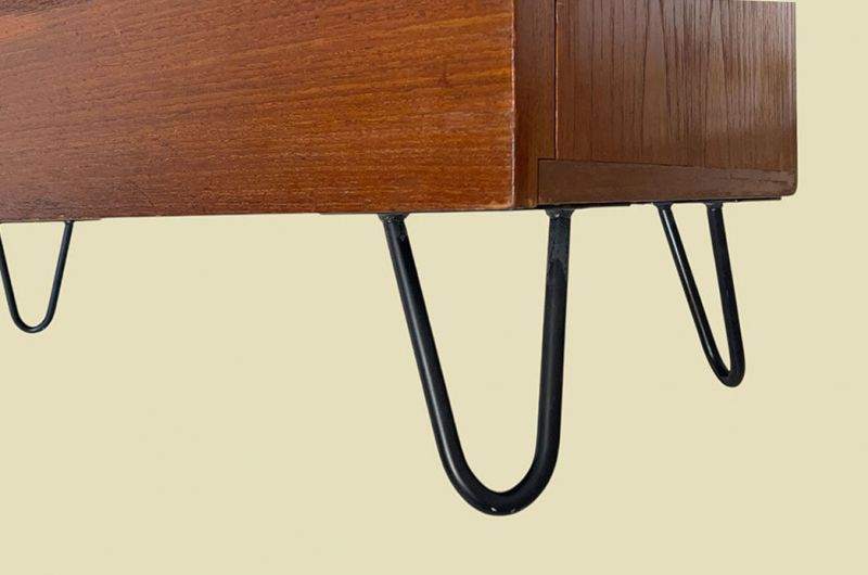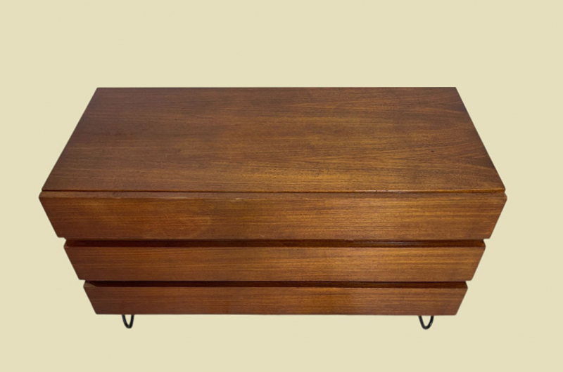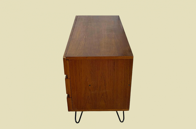 TOP Zustand. Hierbei handelt es sich um eine antike 60er Jahre Teak Sideboard Kommode. Die antike 60er Jahre Teak Sideboard Kommode ist aus Teakholz und hat eine sehr gut erhaltene gepflegte Oberfläche. Die Schubladen sind leicht zu öffnen. Hierbei zeigt sich die hohe Qualitätsverarbeitung, da ausschließlich Vollholz verwendet wurde. Selbst der Schubladen Boden ist aus Vollholz. Die Seitenwände der Schubladen sind mit der hochwertigen Schwalbenschwanz Verzahnung verbunden. Die jeweils 2 Griffe finden sich "fast versteckt" unterhalb der jeweiligen Schublade. Oberhalb befindet sich eine sehr gut erhaltene Deckplatte, ohne Brandflecken oder Wasserränder. Die Gründerzeit Kommode steht auf typischen 60er Jahre Vollmetall Füßen. Die antike 60er Jahre Teak Sideboard Kommode ist ein wahres Platzwunder, in dem jede Menge verstaut werden kann. Auf jeden Fall hat das Möbel eine ausgewogene Formgebung und ist ein Eye-Catcher in jeder gut situierten Wohnung. Das Möbel stammt aus einem tierfreien Nichtraucher Haushalt und ist ist in einem schönen wohnfertigen Zustand.