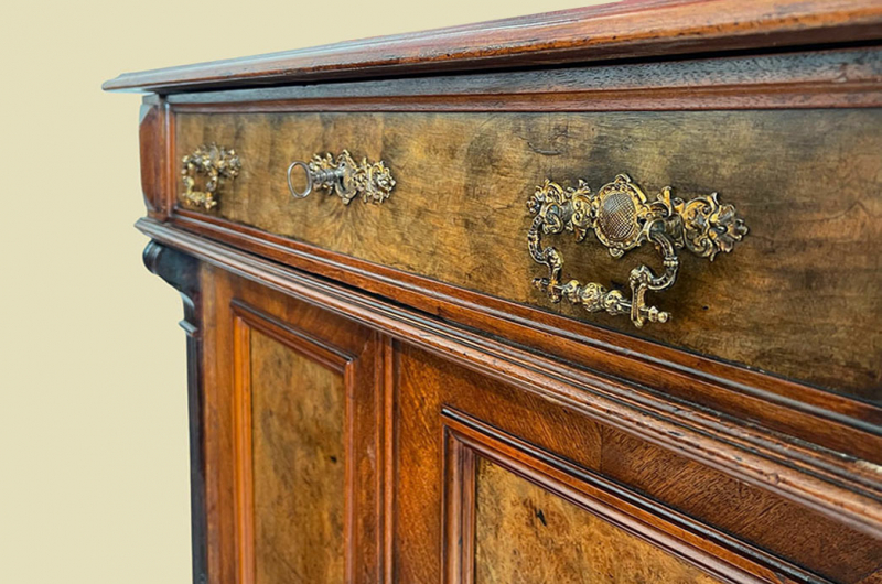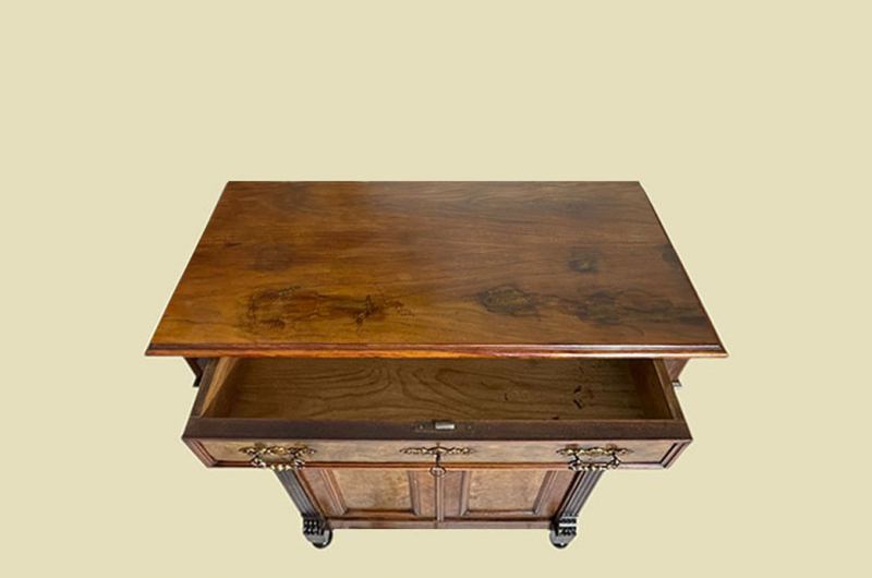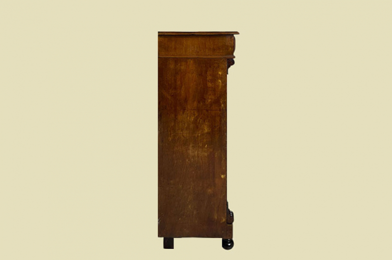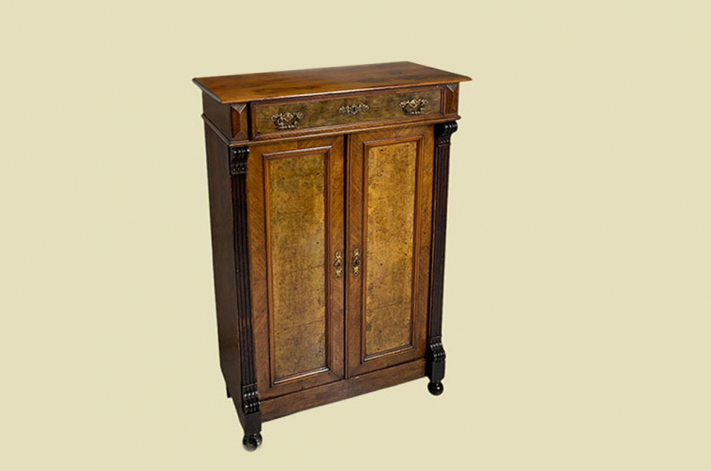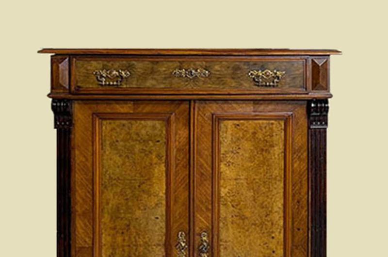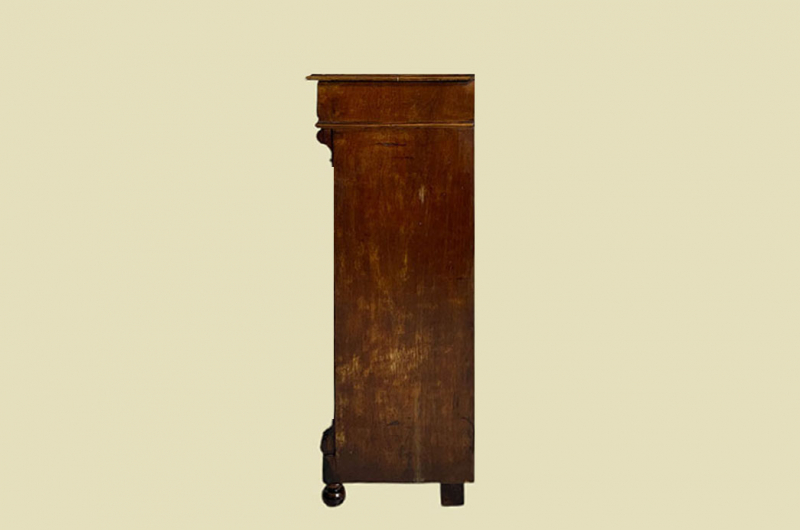 Hierbei handelt es sich um ein antikes Gründerzeit Vertiko von 1880. Das antike Gründerzeit Vertiko ist aus Nußbaum und hat eine Original Schellack Oberfläche. Links und recht neben den Türen befinden sich gerillte Vollholz Leisten welche in geschnitzte Kapitäle übergehen. Die Türen sind fassettiert. Innerhalb der Türen befinden sich schöne Nußbaum Wurzelholz Füllungen. Oberhalb befinden sich eine praktische Schublade. Die Schublade ist leichtgängig zu öffnen und abschließbar. Darüber befindet sich eine stabile Deckplatte. Die Deckplatte hat der Zeit entsprechend ausgebesserte Gebrauchspuren. Das antike Gründerzeit Vertiko hat antike Messing Beschläge und Griffe. Die Türe und Schublade haben funktionierende Schlösser. Das antike Gründerzeit Vertikos wird mit passendem Schlüssel ausgeliefert. Im inneren des antiken Gründerzeit Vertikos befinden sich 3 heraus nehmbare Regalbretter. Die Regalbretter sind höhenverstellbar. Das antike Gründerzeit Vertiko steht auf gedrechselten Vollholz Füßen. Die Rückwand wurde seiner Zeit einmal erneuert. Das Möbel hat auf jeden Fall eine ausgewogene Formgebung und ist ein Eye-Catcher in jeder gut situierten Wohnung. Das Möbel stammt aus einem tierfreien Nichtraucher Haushalt und ist in einem schönen wohnfertigen Zustand.