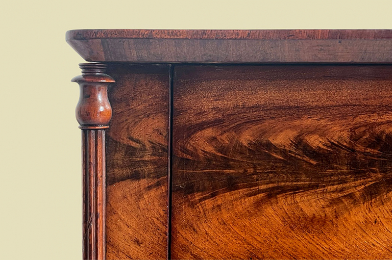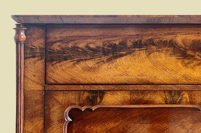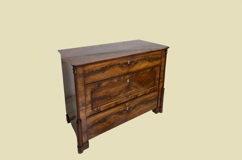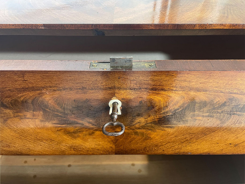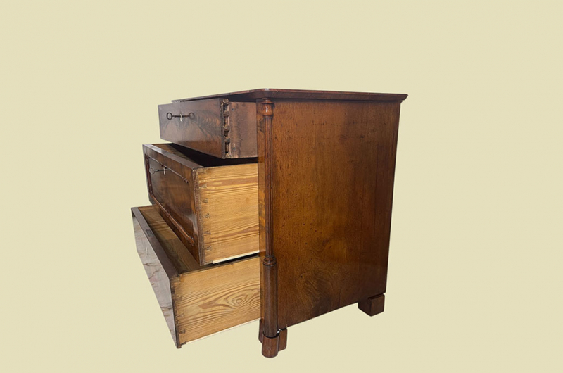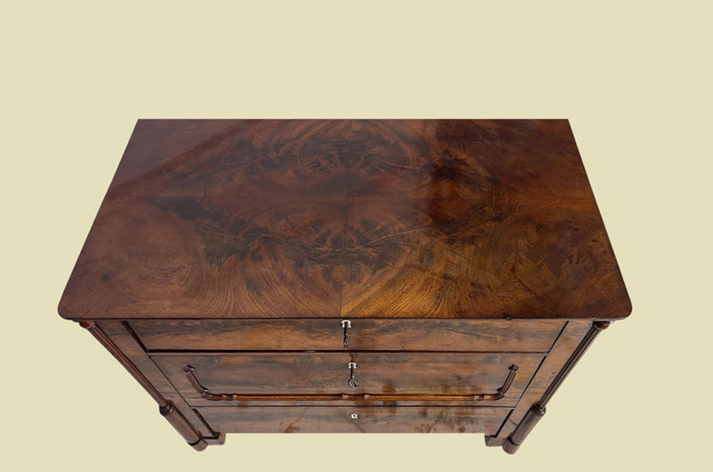 Top Zustand. HANDPOLIERT! Hierbei handelt es sich um ein antike Louis Philippe Kommode von 1840. Die antike Louis Philippe Kommode ist aus Mahagoni und hat eine handpolierte leicht glänzende Schellack Oberfläche. Die obere Deckplatte ist typisch im Louis Phillip geformt. Die antike Kommode hat 3 leichtgängig zu öffnende Schubladen. An den Schubladen befinden sich praktische Original Schlüssel zum aufziehen. Die Beschläge sind aus Efenbein*. Die antike Louis Philippe Kommode hat reichlich Stauraum. die antike Kommode hat eine durchgängige Holzmaserung von der obersten Schublade bis nach unten. Links und rechts neben den Schubladen befinden sich Vollholz Leisten welche in geschnitzte Kapitäle übergehen. Die antike Louis Philippe Kommode steht auf stabilen gedrechselten Vollholz Füßen. Das Möbel hat eine ausgewogene Formgebung und ist ein Eye-Catcher in jeder gut situierten Wohnung. Das Möbel stammt aus einem tierfreien Nichtraucher Haushalt und ist in einem schönen wohnfertigen Zustand.