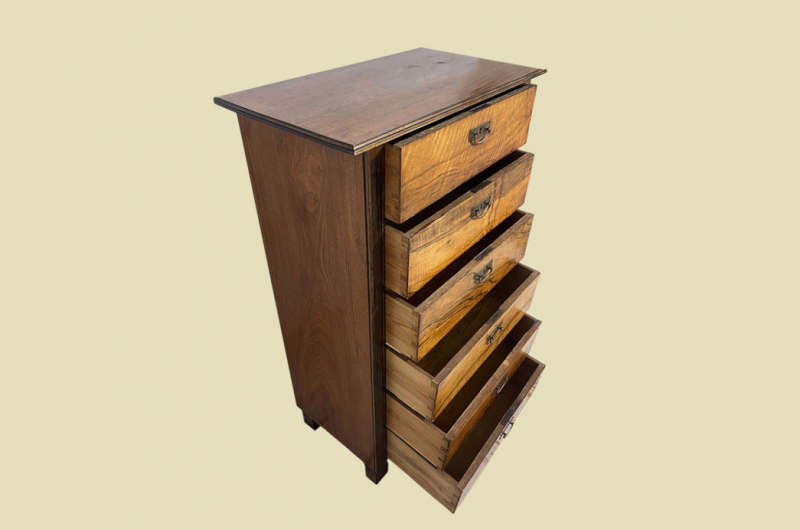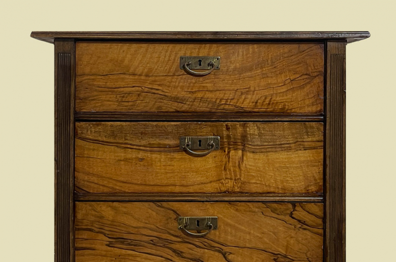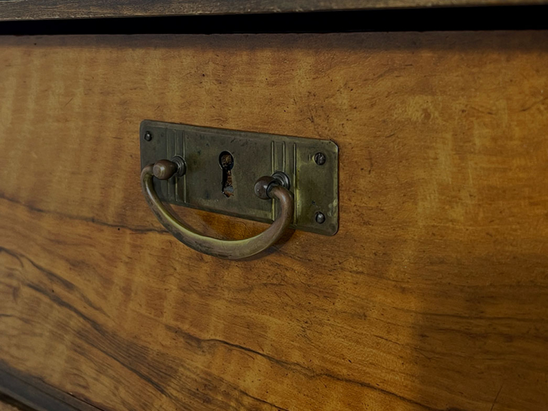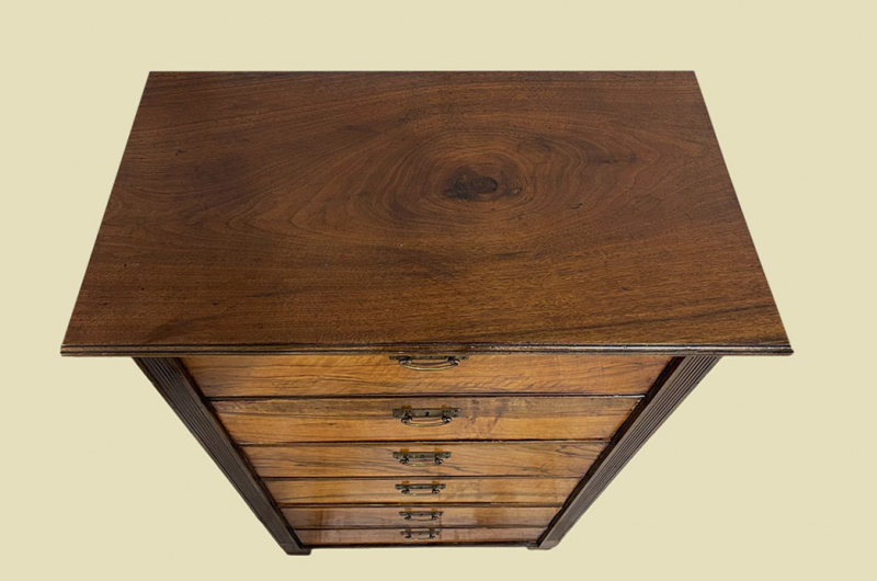 Hierbei handelt es sich um eine antike Gründerzeit 6-Schüber Kommode von 1880. Die antike Gründerzeit Kommode ist aus Nußbaum und hat eine Original Schellack Oberfläche. Die Schubladen sind fassettiert und haben schöne Nußbaum Wurzelholz Füllungen. Links und rechts neben den Schubladen der antiken Gründerzeit Kommode befinden sich gerillte Vollholz Leisten welche in geschnitzte Kapitäle übergehen. Die Schubladen sind leichtgängig zu öffnen. Die Gründerzeit Kommode hat schöne antike Messing Beschläge. Alle 6 Schlösser sind vorhanden. Oberhalb befindet sich eine stabile sehr gut erhaltene Deckplatte. Die Gründerzeit Kommode steht auf stabilen Vollholz Füßen. Die Kommode ist ein wahres Platzwunder, in dem jede Menge verstaut werden kann. Auf jeden Fall hat das Möbel eine ausgewogene Formgebung und ist ein Eye-Catcher in jeder gut situierten Wohnung. Das Möbel stammt aus einem tierfreien Nichtraucher Haushalt und ist ist in einem schönen wohnfertigen Zustand.