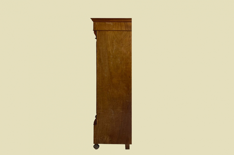 Hierbei handelt es sich um einen antiken Gründerzeit Kleiderschrank von 1880. Der antike Gründerzeit Kleiderschrank ist aus Nußbaum und hat eine Original Schellack Oberfläche. Neben den Türen des antiken Gründerzeit Kleiderschranks befinden sich gerillte Nußbaum Vollholz Leisten welche in geschnitzte Kapitäle übergehen. Die Türen sind fassettiert. Innerhalb der Türen befinden sich Original Nußbaum Wurzelholz Füllungen. Der antike Gründerzeit Kleiderschrank hat antike Messing Beschläge. Die Türen haben ein funktionierendes Schloss. Der antike Gründerzeit Kleiderschrank wird mit passendem Schlüssel ausgeliefert. Im inneren des antiken Gründerzeit Kleiderschranks befindet sich eine stabile Kleiderstange und Kleiderhaken. Auf Wunsch können von uns optional Regalbretter eingebaut werden (siehe Beispiel Fotos). Das Möbel kann mit 2 arretierbaren Riegeln zerlegt werden. So lassen sich Dach, Rückwand, Stange und Türen demontieren. So kann der Schrank bequem mit nur 2 Personen durch enge Treppenhäuser oder in den "4. Stock" getragen werden. Der antike Gründerzeit Kleiderschrank steht auf stabilen gedrechselten Vollholz Füßen. Das Möbel hat auf jeden Fall eine ausgewogene Formgebung und ist ein Eye-Catcher in jeder gut situierten Wohnung. Das Möbel stammt aus einem tierfreien Nichtraucher Haushalt und ist in einem schönen wohnfertigen Zustand.