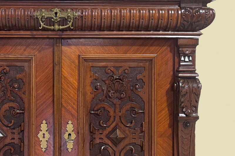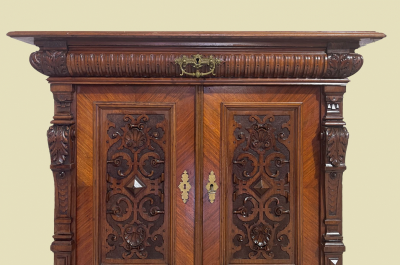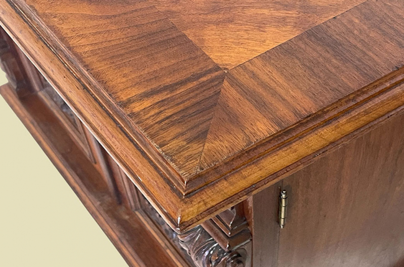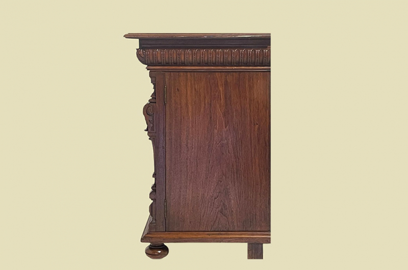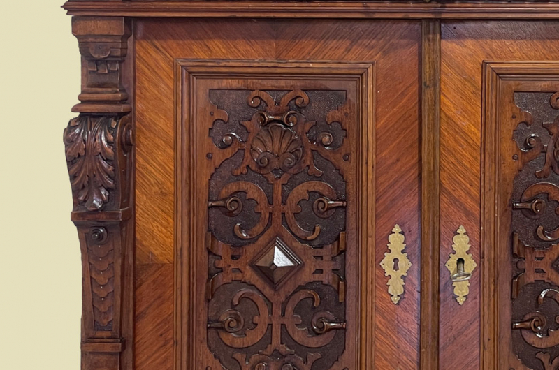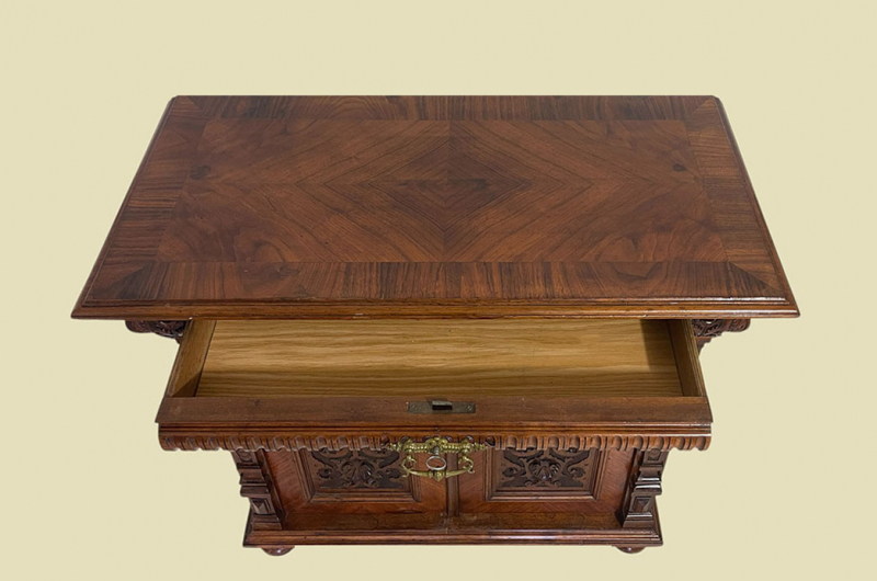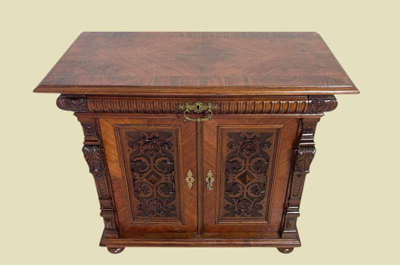 Hierbei handelt es sich um eine antike Gründerzeit Kommoden Anrichte von 1880. Die antike Gründerzeit Kommoden Anrichte ist aus Nußbaum und hat eine Original Schellack Oberfläche. Links und rechts neben den Türen der antiken Gründerzeit Kommoden Anrichte befinden sich Vollholz Säulen welche in geschnitzte Kapitäle übergehen. Die Schublade ist leichtgängig zu öffnen. Die Schublade hat ein funktionierendes Schloss. Die antike Gründerzeit Kommoden Anrichte wird mit passendem Schlüssel ausgeliefert. In den Türen befinden sich schöne dezente Gründerzeit Schnitzereien. Auch die Türen sind selbstverständlich abschließbar. Hinter den Türen befindet sich ein herausnehmbares Regalbrett. Die obere Ablageplatte ist stabil und in gutem Zustand. Die Gründerzeit Kommoden Anrichte hat antike Gründerzeit Messing Beschläge. Die Gründerzeit Kommoden Anrichte steht auf stabilen gedrechselten Vollholz Füßen. Die antike Gründerzeit Kommoden Anrichte ist ein wahres Platzwunder, in der jede Menge verstaut werden kann. Auf jeden Fall hat das Möbel eine ausgewogene Formgebung und ist ein Eye-Catcher in jeder gut situierten Wohnung. Das Möbel stammt aus einem tierfreien Nichtraucher Haushalt und ist ist in einem schönen wohnfertigen Zustand.