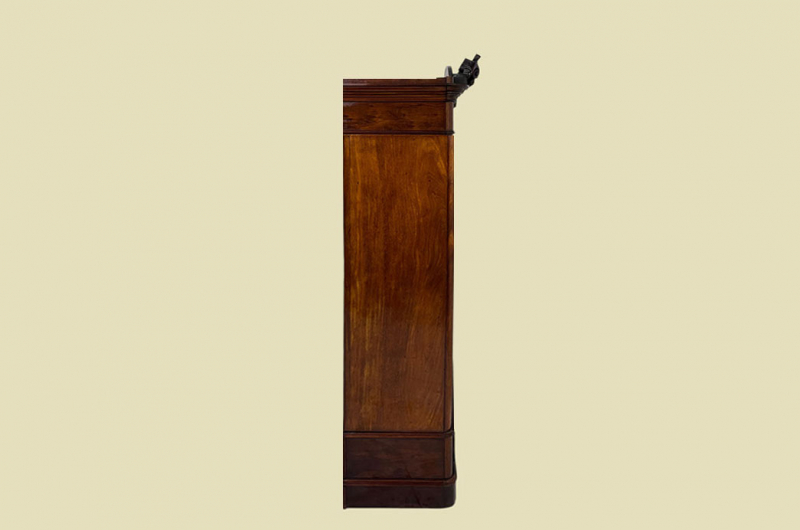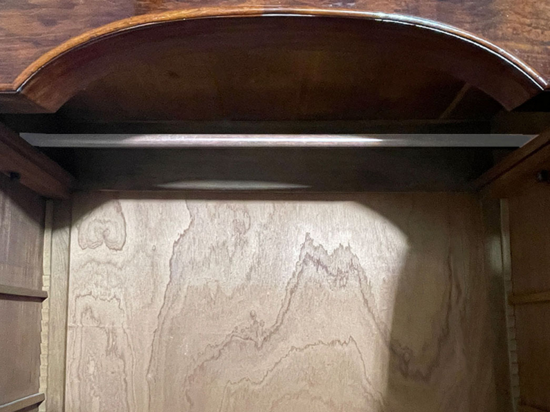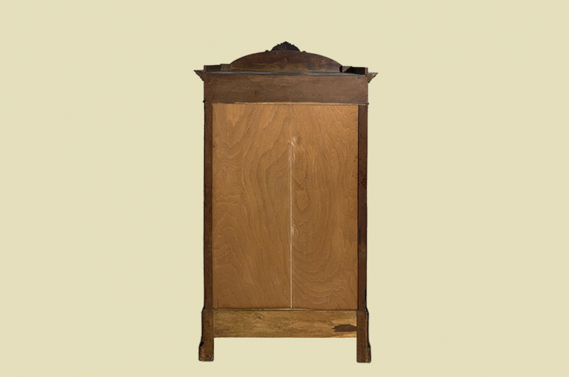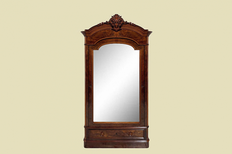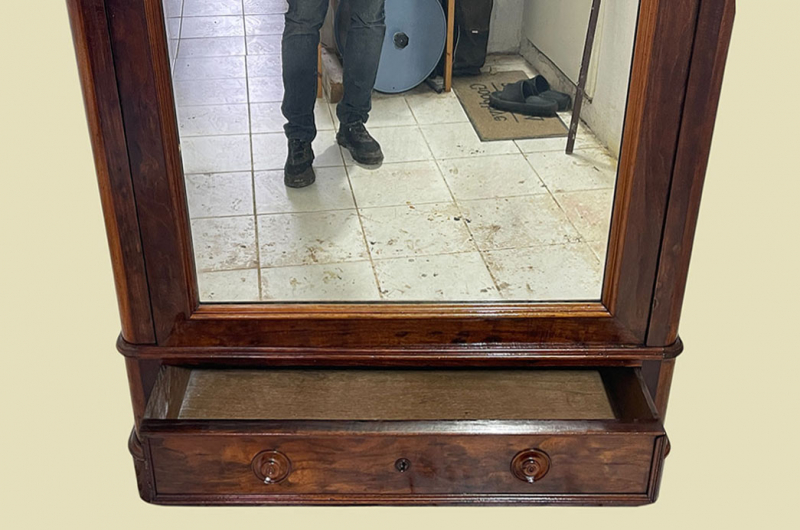 Hierbei handelt es sich um einen antiken Louis Philippe Schrank von 1840. Der Schrank Ist aus Mahagoni Nußbaum und hat eine Original Schellack Oberfläche. Unterhalb befindet sich eine praktische Schublade. Die Türe ist fassettiert. Links und rechts neben den Türen befinden sich Vollholz Leisten. Innerhalb der Türe befindet sich eine praktischer Spiegel. Der Spiegel ist dem alter entsprechend in einem guten Zustand. Selbstverständlich hat ein antiker Spiegel immer auch ein paar kleinere Altersspuren. Man kann sich jedoch klar und deutlich erkennen. Oberhalb befindet sich ein eine schöne Bekrönung. Die Türe habt ein funktionierendes Doppel-Schloss. Der antike Louis Philippe Schrank wird mit passendem Original Schlüssel ausgeliefert. Im inneren des antiken Louis Philippe Schranks befindet sich eine praktische Kleiderstange. Auf Wunsch können von uns optional Regalbretter eingebaut werden (siehe Beispiel Fotos). Das Möbel kann mit nur 4 Schrauben (siehe Foto) KOMPLETT zerlegt werden. So lassen sich Dach, Schublade, Stange, Seitenwände, Bodenteil, Rückwand und Türen komplett demontieren. So kann der Schrank bequem von nur 1 (!) Personen durch enge Treppenhäuser oder in den "4. Stock" getragen werden. Das Möbel hat auf jeden Fall eine ausgewogene Formgebung und ist ein Eye-Catcher in jeder gut situierten Wohnung. Das Möbel stammt aus einem tierfreien Nichtraucher Haushalt und ist in einem schönen wohnfertigen Zustand.