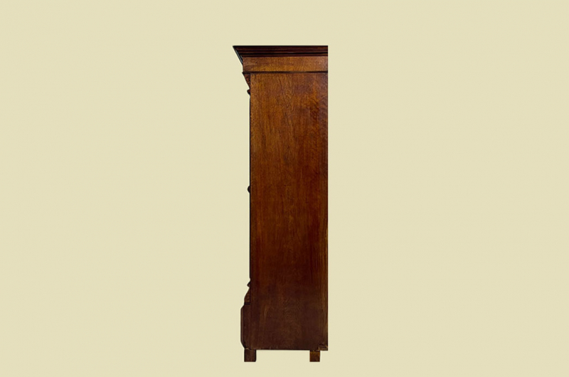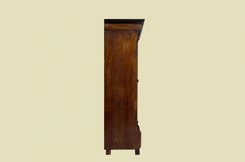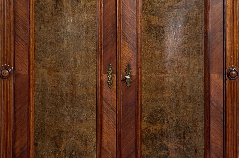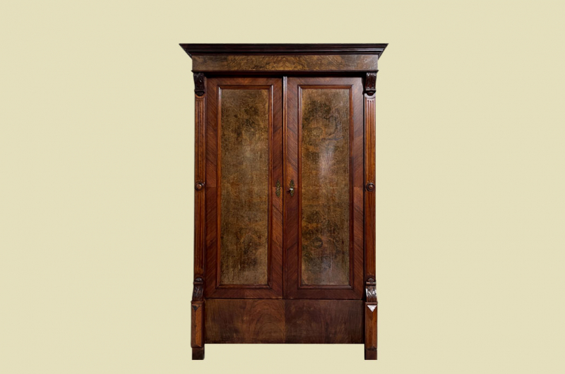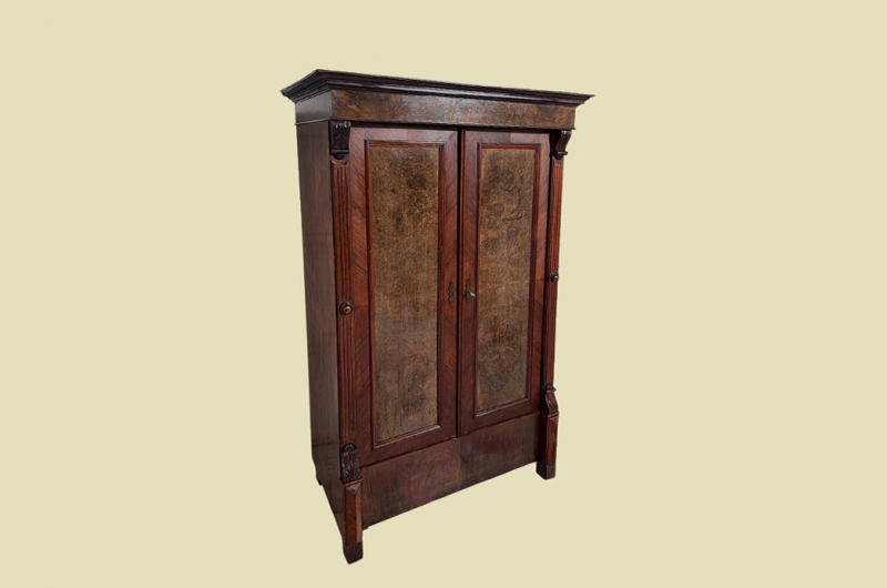 Hierbei handelt es sich um einen antiken Gründerzeit Kleiderschrank von 1880. Der antike Gründerzeit Kleiderschrank ist aus Nußbaum und hat eine Original Schellack Oberfläche. Neben den Türen des antiken Gründerzeit Kleiderschranks befinden sich gerillte Nußbaum Vollholz Leisten welche in geschnitzte Kapitäle übergehen. Die Türen sind fassettiert. Innerhalb der Türen befinden sich Original Nußbaum Wurzelholz Füllungen. Der antike Gründerzeit Kleiderschrank hat antike Messing Beschläge. Die Türen haben ein funktionierendes Schloss. Der antike Gründerzeit Kleiderschrank wird mit passendem Schlüssel ausgeliefert. Im inneren des antiken Gründerzeit Kleiderschranks befindet sich eine stabile Kleiderstange und Kleiderhaken. Auf Wunsch können von uns optional Regalbretter eingebaut werden (siehe Beispiel Fotos). Das Möbel kann mit 2 arretierbaren Riegeln zerlegt werden. So lassen sich Dach, Stange und Türen demontieren. So kann der Schrank bequem mit nur 2 Personen durch enge Treppenhäuser oder in den "4. Stock" getragen werden. Der antike Gründerzeit Kleiderschrank steht auf stabilen Vollholz Füßen. Das Möbel hat auf jeden Fall eine ausgewogene Formgebung und ist ein Eye-Catcher in jeder gut situierten Wohnung. Das Möbel stammt aus einem tierfreien Nichtraucher Haushalt und ist in einem schönen wohnfertigen Zustand.
