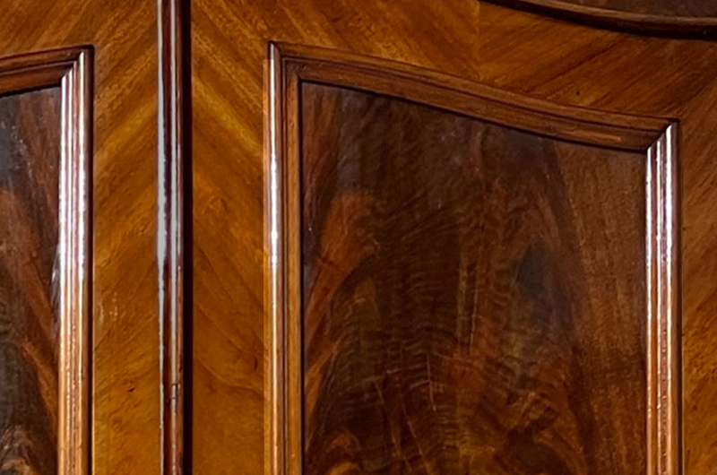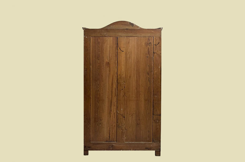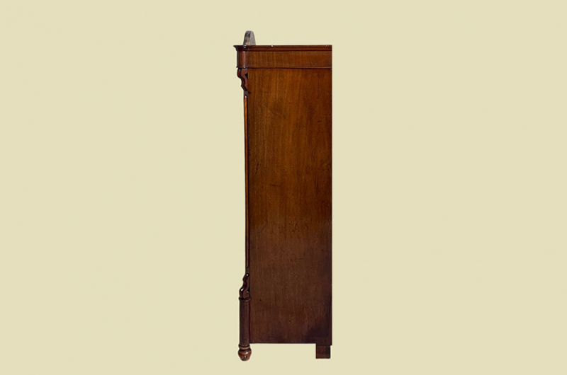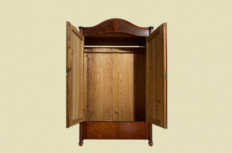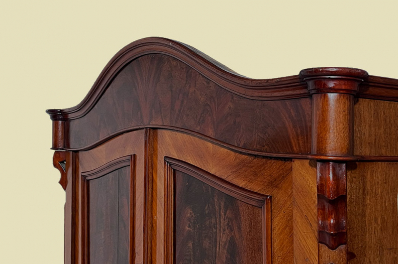 Hierbei handelt es sich um einen antiken Louis Philippe Schrank von 1840. Der Schrank Ist aus Mahagoni und hat eine Original Schellack Oberfläche. Die Türen sind fassettiert. Links und rechts neben den Türen befinden sich Vollholz Leisten welche in geschnitzte Kapitäle übergehen. Innerhalb der Türe befindet sich eine schöne Pyramiden Mahagoni Füllung. Oberhalb befindet sich ein eine dezente Bekrönung. Die Türen haben ein funktionierendes Schloss. Der antike Louis Philippe Schrank wird mit passendem Schlüssel ausgeliefert. Im inneren des antiken Louis Philippe Schranks befindet sich eine Kleiderstange und Kleiderhaken. Auf Wunsch können von uns optional Regalbretter eingebaut werden (siehe Beispiel Fotos). Der antike Louis Philippe Schrank steht auf typischen Louis Philippe Vollholz Füßen. Das Möbel kann mit 2 Holzriegeln (siehe Foto) zerlegt werden. So lassen sich Dach, Stange, Rückwand und Türen demontieren. So kann der Schrank bequem mit nur 2 Personen durch enge Treppenhäuser oder in den "4. Stock" getragen werden. Das Möbel hat auf jeden Fall eine ausgewogene Formgebung und ist ein Eye-Catcher in jeder gut situierten Wohnung. Das Möbel stammt aus einem tierfreien Nichtraucher Haushalt und ist in einem schönen wohnfertigen Zustand.