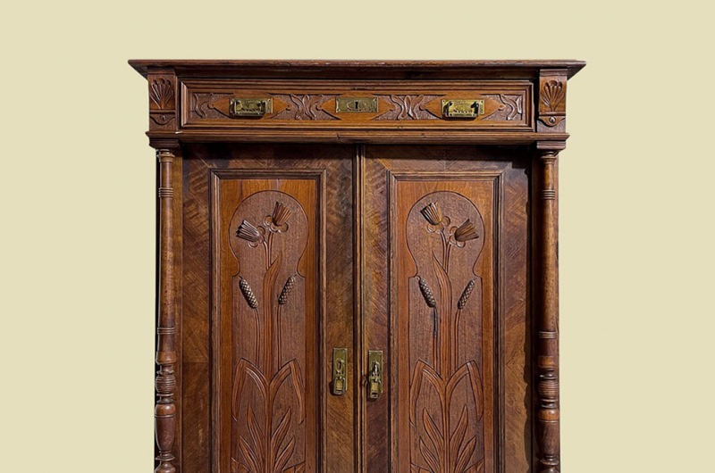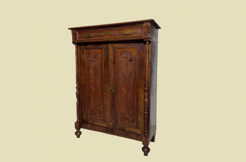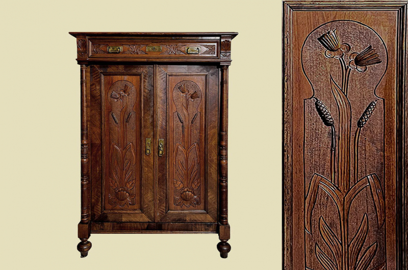 Hierbei handelt es sich um ein antikes Jugendstil Vertiko von 1920. Das antike Jugendstil Vertiko ist aus Nußbaum und hat eine Original Schellack Oberfläche. Das antike Jugendstil Vertiko hat eine geräumige abschließbare Schublade. Die Schublade des antiken Jugendstil Vertikos ist leichtgängig zu öffnen. Sie hat zwei Stabile antike Messing Griffe zum öffnen und ein funktionierendes Schloss. Links und rechts neben den Türen befinden sich Vollholz Säulen welche in geschnitzte Kapitäle über gehen. Die Türen sind fassettiert. Innerhalb der Türen befinden sich schöne geschnitzte Jugendstil Schnitzereien. Das Motiv sind - wie der Jugendstil Künstler Gustav Klimt in seinen Bildern des öfteren verwendet hat - Lebensbaum Elemente. Die Türen und die Schublade sind abschließbar und werden mit passendem Schlüssel ausgeliefert. Im inneren des antiken Jugendstil Vertiko befinden sich 3 heraus nehmbare Vollholz Regalbretter. Die Türen und Schubladen des Jugendstil Vertikos haben antike Messing Beschläge. Das antike Jugendstil Vertiko steht auf stabilen gedrechselten Vollholz Füßen. Auf jeden Fall hat das Möbel eine ausgewogene Formgebung und ist ein Eye-Catcher in jeder gut situierten Wohnung. Das antike Möbel stammt aus einem tierfreien Nichtraucher Haushalt und ist in einem schönen wohnfertigen Zustand.