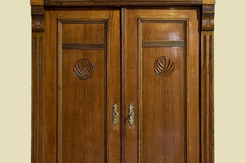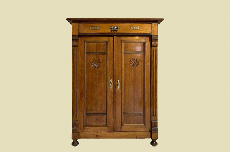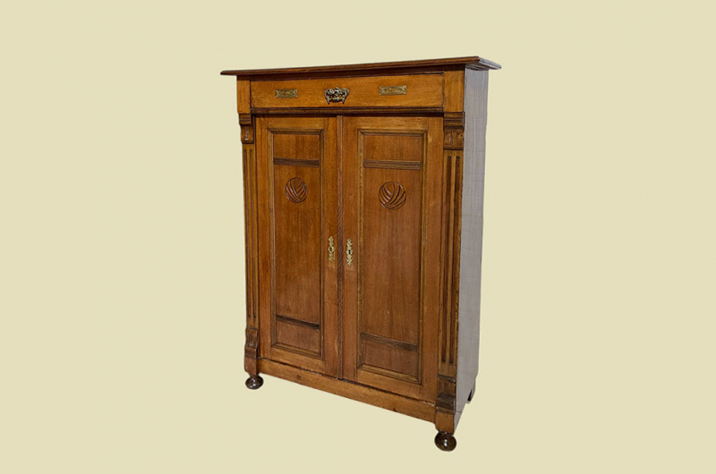Hierbei handelt es sich um ein antikes Jugendstil Vertiko von 1920. Das antike Jugendstil Vertiko ist aus Nußbaum und hat eine Original Schellack Oberfläche. Das antike Jugendstil Vertiko hat eine geräumige abschließbare Schublade. Die Schublade des antiken Jugendstil Vertikos ist leichtgängig zu öffnen. Sie hat einen Messing Griff und ein funktionierendes Schloss. Links und rechts neben den Türen befinden sich gerillte Vollholz Leisten welche in geschnitzte Kapitäle über gehen. Die Türen sind fassettiert. Innerhalb der Türen befinden sich schöne geschnitzte Jugendstil Schnitzereien. Die Türen und die Schublade sind abschließbar und werden mit passendem Schlüssel ausgeliefert. Im inneren des antiken Jugendstil Vertiko befinden sich 3 heraus nehmbare Vollholz Regalbretter. Die Türen und Schubladen des Jugendstil Vertikos haben antike Messing Beschläge. Das antike Jugendstil Vertiko steht auf stabilen gedrechselten Vollholz Füßen. Auf jeden Fall hat das Möbel eine ausgewogene Formgebung und ist ein Eye-Catcher in jeder gut situierten Wohnung. Das antike Möbel stammt aus einem tierfreien Nichtraucher Haushalt und ist in einem schönen wohnfertigen Zustand.
