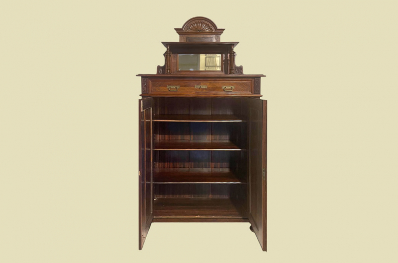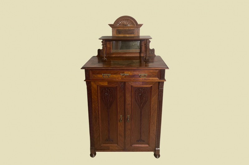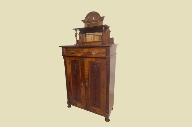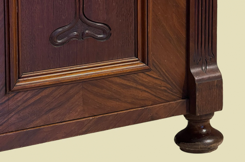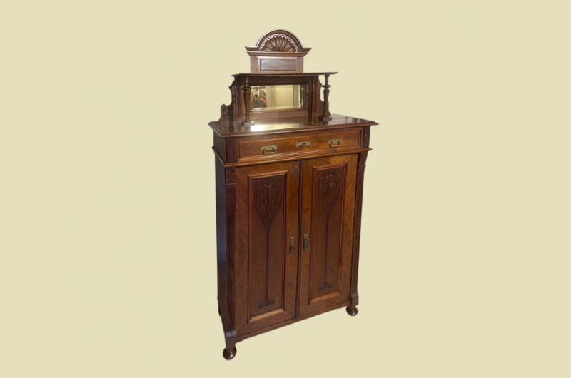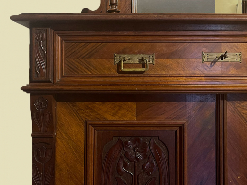 Hierbei handelt es sich um ein edles antikes Jugendstil Vertiko von 1920. Das antike Jugendstil Vertiko ist aus Nußbaum und hat eine Original Schellack Oberfläche. Oberhalb befindet sich ein Original Jugendstil Aufsatz mit Spiegel. Der Spiegel ist in gutem unbeschädigtem Zustand und aus Fassetten geschliffenen Kristallglas. Das antike Jugendstil Vertiko hat eine geräumige abschließbare Schublade. Die Schublade des antiken Jugendstil Vertikos ist leichtgängig zu öffnen. Sie hat zwei Stabile antike Messing Griffe zum öffnen und ein funktionierendes Schloss. Links und rechts neben den Türen befinden sich Vollholz Leisten welche in geschnitzte Kapitäle über gehen. Die Türen sind fassettiert. Innerhalb der Türen befinden sich schöne geschnitzte Jugendstil Schnitzereien. Das Motiv ist - wie der Jugendstil Künstler Gustav Klimt in seinen Bildern des öfteren verwendet hat Lebensbaum Elemente. Die Türen und die Schublade sind abschließbar und werden mit passendem Schlüssel ausgeliefert. Im inneren des antiken Jugendstil Vertiko befinden sich 3 heraus nehmbare Vollholz Regalbretter. Die Regalbretter sind auf höhen verstellbaren Zahnleisten gelagert. Die Türen und Schubladen des Jugendstil Vertikos haben antike Messing Beschläge. Das antike Jugendstil Vertiko steht auf stabilen gedrechselten Vollholz Füßen. Der Aufsatz kann für den Transport abgenommen werden. Auf jeden Fall hat das Möbel eine ausgewogene Formgebung und ist ein Eye-Catcher in jeder gut situierten Wohnung. Das antike Möbel stammt aus einem tierfreien Nichtraucher Haushalt und ist in einem schönen wohnfertigen Zustand.