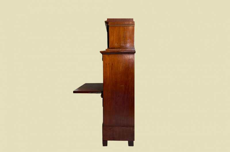 Hierbei handelt es sich um einen echten antiken Biedermeier Sekretär von 1800-1820. Der Sekretär hat noch seinen Original Aufsatz. Der antiken Biedermeier Sekretär ist aus Mahagoni und hat eine gut überarbeitete leicht glänzende stabile Oberfläche. Der Vorbesitzer hat den antiken Biedermeier Sekretär vor ca 10 Jahren komplett für 2.000,-€ neu aufarbeiten lassen. In der Mitte befindet sich eine Schreibplatte zum aufklappen. Die Klappe ist in perfektem Zustand und hat keine Spannrisse. Der antike Biedermeier Sekretär hat ein gut funktionierendes Hauptschloß. Die Klappe ist unbeschädigt und leichtgängig zu öffnen. Beide Gewichte sind vorhanden. Die Klappe des antiken Biedermeier Sekretärs hat ein funktionierendes Schloss und wird mit passendem Schlüssel ausgeliefert. Der antike Biedermeier Sekretär hat ein durchgängiges Furnierbild von ganz oben - über die Klappe - bis ganz unten, was selten und kostbar ist. Im Innenbereich des antiken Biedermeier Sekretärs befinden sich kleine Schubladen. In der Mitte befindet sich eine kleine Türe. Die Türe ist ebenfalls abschließbar. Oben befinden sich weitere Schubladen. Es werden weitere Schlüssel zum aufziehen mitgeliefert. Der antike Biedermeier Sekretär steht auf stabilen Vollholz Füßen. Der Aufsatz kann für den Transport abgenommen werden. Auf der Rückseite erkennt man die handgehobelte Verarbeitung. Das Möbel hatte selbstverständlich in den letzen 200 Jahren auch mal einen Holzwurm gehabt welcher jedoch schon längst in Rente gegangen ist. Das Möbel hat auf jeden Fall eine ausgewogene Formgebung und ist ein Eye-Catcher in jeder gut situierten Wohnung. Das Möbel stammt aus einem tierfreien Nichtraucher Haushalt und ist in einem schönen wohnfertigen Zustand.