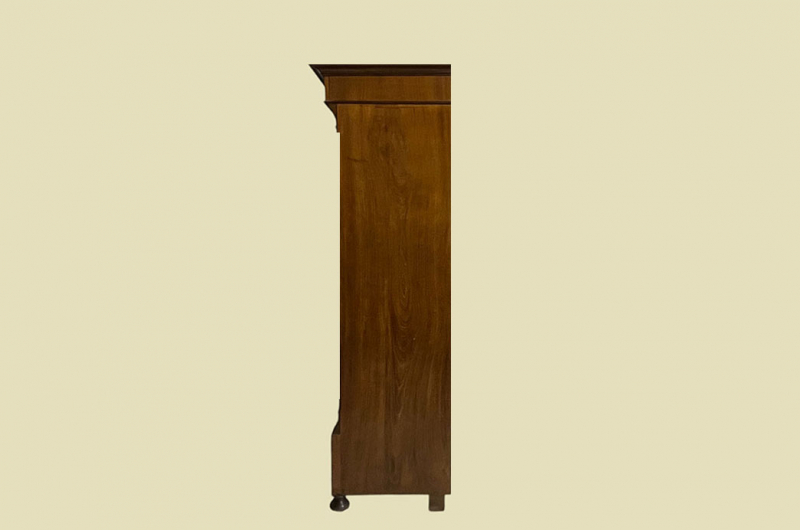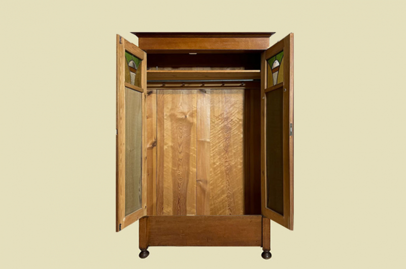 Hierbei handelt es sich um ein antikes Jugendstil Schrank von 1920. Der antike Jugendstil Schrank ist aus Nußbaum und hat eine Original Schellack Oberfläche. Links und recht neben den Türen befinden sich Vollholz Leisten welche in geschnitzte Kapitäle übergehen. Die Türen sind fassettiert. Innerhalb der Türen befinden sich schöne Jugendstil Fenster. Der antike Jugendstil Schrank hat antike Jugendstil Messing Beschläge. Die Türen haben ein funktionierendes Schloss und sind abschließbar. Der antike Jugendstil Schrank wird mit passendem Schlüssel ausgeliefert. Im Inneren des antiken Jugendstil Schranks befinden sich eine Kleiderstange, Kleiderhaken und ein Vollholz Regalbrett. Auf Wunsch können von uns Optional weitere Regalbretter eingebaut werden (siehe Beispiel Fotos). Das Möbel kann mit 2 Holzriegeln zerlegt werden. So lassen sich Dach, Stange, Kleiderhaken, Regalbrett und Türen demontieren. So kann der Schrank bequem mit nur 2 Personen durch enge Treppenhäuser oder in den "4. Stock" getragen werden. Das Möbel hat auf jeden Fall eine ausgewogene Formgebung und ist ein Eye-Catcher in jeder gut situierten Wohnung. Das Möbel stammt aus einem tierfreien Nichtraucher Haushalt und ist in einem schönen wohnfertigen Zustand.