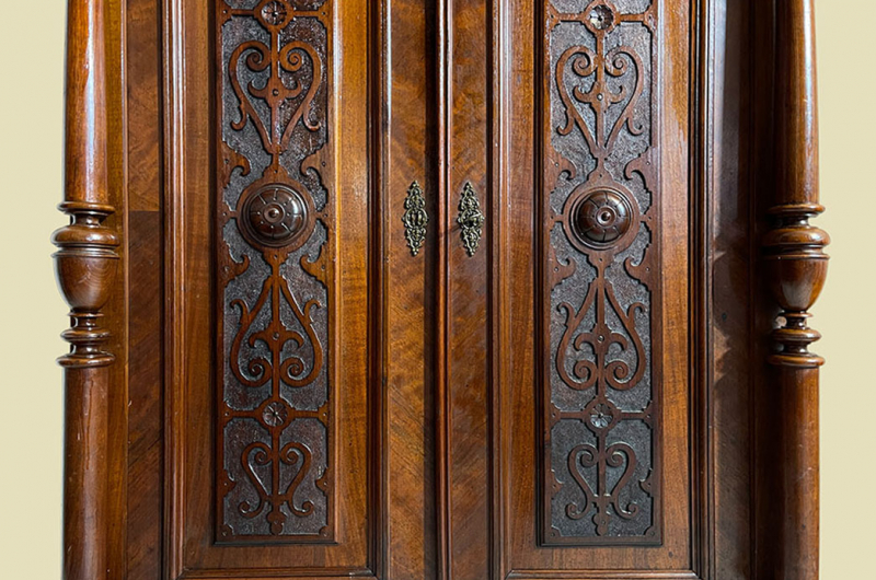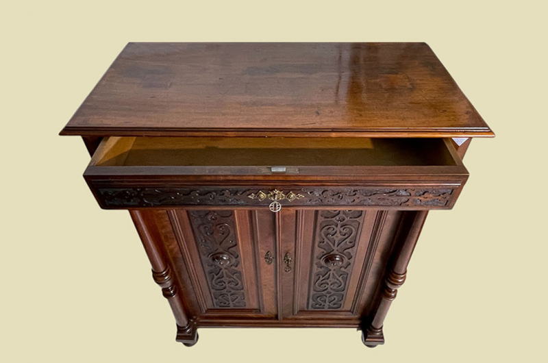 Hierbei handelt es sich um ein antikes Gründerzeit Vertiko von 1880. Das antike Gründerzeit Vertiko ist aus Nußbaum und hat eine Original Schellack Oberfläche. Das Vertiko hat schöne gedrechselten Gründerzeit Säulen. Das antike Gründerzeit Vertiko hat eine geräumige abschließbare Schublade. Die Schublade des antiken Gründerzeit Vertikos ist leichtgängig zu öffnen. Sie hat zwei Stabile antike Messing Griffe zum öffnen und ein funktionierendes Schloss. Links und rechts neben den Türen befinden sich gedrechselte Vollholz Säulen welche in geschnitzte Kapitäle über gehen. Die Türen des antiken Gründerzeit Vertikos sind kassettiert und haben edle geschnitzte Nußbaum Füllungen. Die Türen und die Schublade sind abschließbar und werden mit passendem Schlüssel ausgeliefert. Im inneren des antiken Gründerzeit Vertiko befinden sich 3 heraus nehmbare Vollholz Regalbretter. Die Regalbretter sind auf höhen verstellbaren Zahnleisten gelagert. Die Türen und Schubladen des Gründerzeit Vertikos haben antike Messing Beschläge. Das antike Gründerzeit Vertiko steht auf gedrechselten Vollholz Füßen. Auf jeden Fall hat das Möbel eine ausgewogene Formgebung und ist ein Eye-Catcher in jeder gut situierten Wohnung. Das antike Möbel stammt aus einem tierfreien Nichtraucher Haushalt und ist in einem schönen wohnfertigen Zustand.