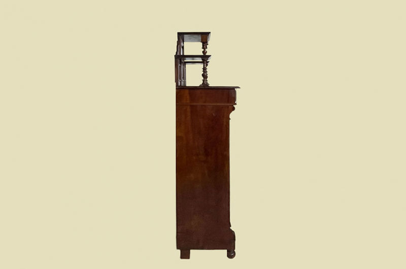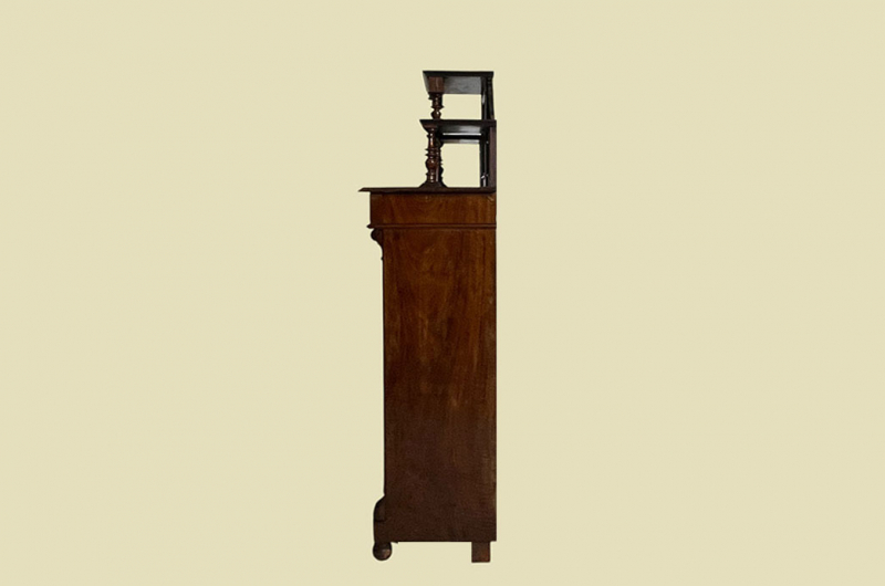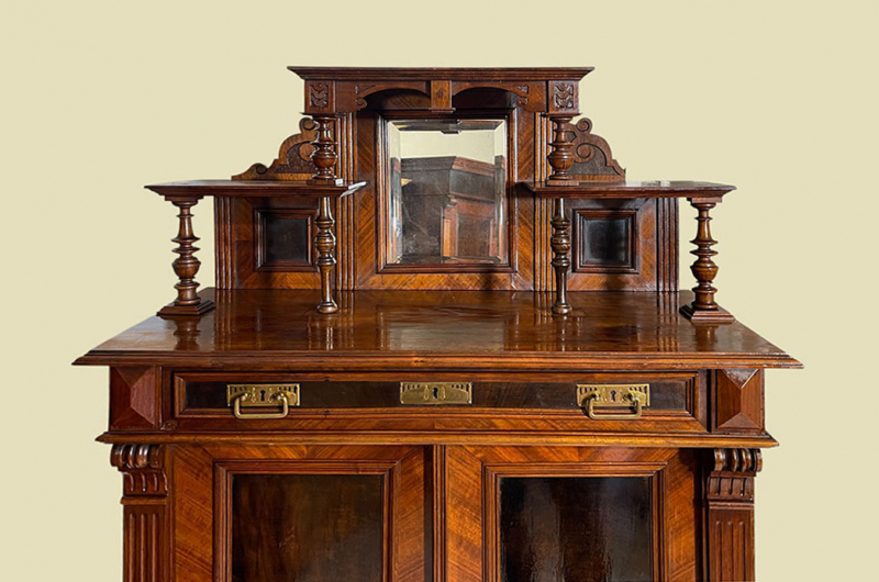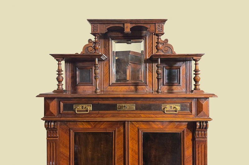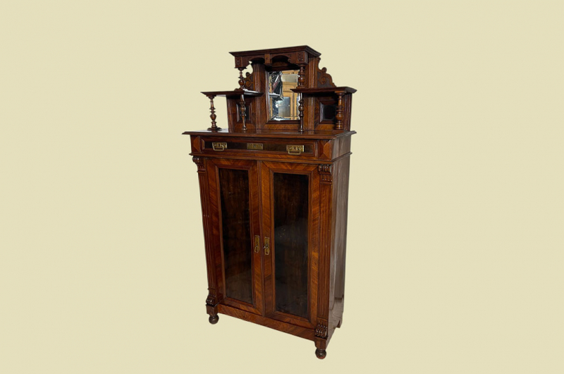 Hierbei handelt es sich um ein antikes Gründerzeit Vertiko von 1880. Das antike Gründerzeit Vertiko ist aus Nußbaum und hat eine Original Schellack Oberfläche. Links und recht neben den Türen befinden sich gerillte Vollholz Leisten welche in geschnitzte Kapitäle übergehen. Die Türen sind fassettiert. Innerhalb der Türen befinden sich schöne Nußbaum Wurzelholz Füllungen. Oberhalb befinden sich eine praktische Schublade. Die Schublade ist leichtgängig zu öffnen und abschließbar. Darüber befindet sich eine stabile Deckplatte. Darüber befindet sich noch der Original Aufsatz. Das antike Gründerzeit Vertiko hat antike Messing Beschläge und Griffe. Die Türe und Schublade haben funktionierende Schlösser. Das antike Gründerzeit Vertikos wird mit passendem Schlüssel ausgeliefert. Im inneren des antiken Gründerzeit Vertikos befinden sich 3 heraus nehmbare Regalbretter. Das antike Gründerzeit Vertiko steht auf gedrechselten Vollholz Füßen. Die Rückwand wurde seiner Zeit einmal erneuert. Das Möbel hat auf jeden Fall eine ausgewogene Formgebung und ist ein Eye-Catcher in jeder gut situierten Wohnung. Der Aufsatz kann für den Transport abgenommen werden. Das Möbel stammt aus einem tierfreien Nichtraucher Haushalt und ist in einem schönen wohnfertigen Zustand.