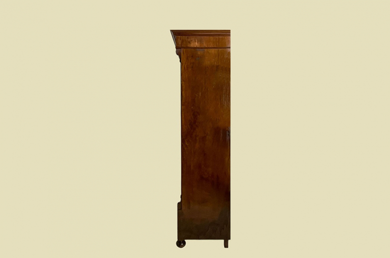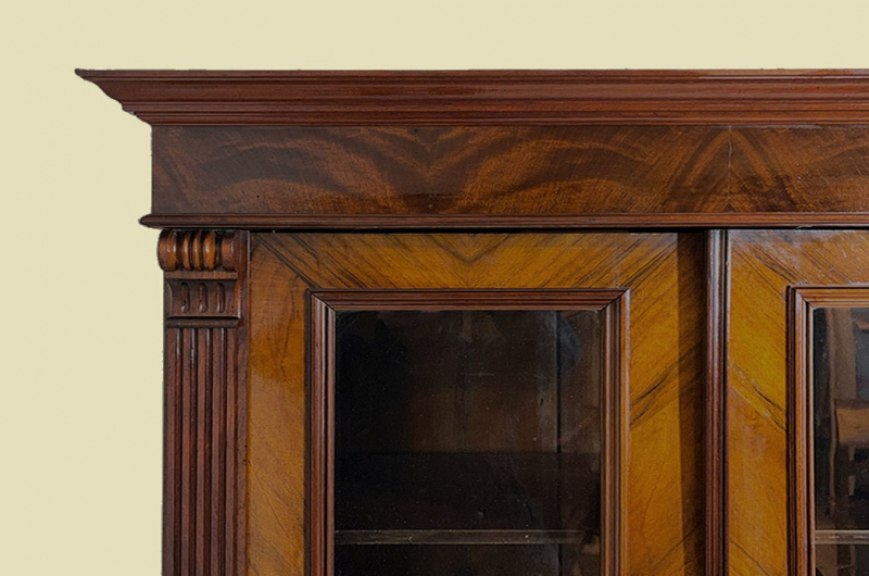 Hierbei handelt es sich um eine antike Gründerzeit Vitrine von 1880. Die antike Gründerzeit Vitrine ist aus Nußbaum und hat eine Original Schellack Oberfläche. Die Türen sind fassettiert. Links und rechts neben den Türen befinden sich gerillte Vollholz Leisten welche in geschnitzte Kapitäle übergehen. Innerhalb der Türfüllungen befinden sich unbeschädigte transparente Glasscheiben. Die Glasscheiben sind noch im Original Zustand wie früher. Innerhalb der Türfüllungen unten befinden sich Wurzelholz Nußbaum Füllungen. Die Türen der antike Gründerzeit Vitrine haben ein funktionierendes Schloß welches mit einem Schlüssel ausgeliefert werden. Im inneren der antike Gründerzeit Vitrine befinden sich 4 stabile Vollholz Regalbretter. Die antike Gründerzeit Vitrine hat antike Messing Beschläge. Die antike Gründerzeit Vitrine steht auf gedrechselten Gründerzeit Füßen. Auf jeden Fall hat das Möbel eine ausgewogene Formgebung und ist ein Eye-Catcher in jeder gut situierten Wohnung. Das Möbel stammt aus einem tierfreien Nichtraucher Haushalt und ist in einem schönen wohnfertigen Zustand.