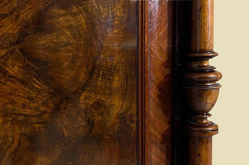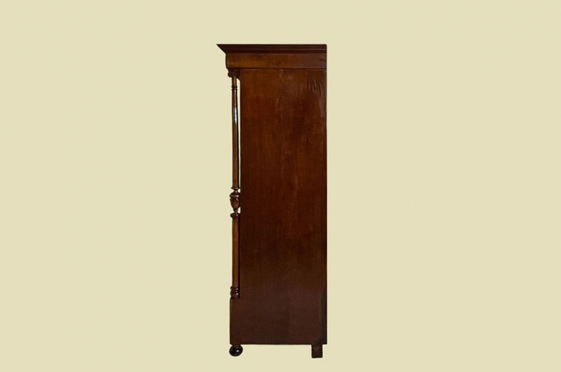 Hierbei handelt es sich um einen antiken Gründerzeit Kleiderschrank von 1880. Der Schrank hat Bügeltiefe. Der antike Gründerzeit Kleiderschrank ist aus Nußbaum und hat eine Original Schellack Oberfläche. Neben den Türen des antiken Gründerzeit Kleiderschranks befinden sich gedrechselte Nußbaum Vollholz Säulen welche in geschnitzte Kapitäle übergehen. Die Türen sind fassettiert. Innerhalb der Türen befinden sich Original Wurzelholz Nußbaum Füllungen. Der antike Gründerzeit Kleiderschrank hat antike Messing Beschläge. Die Türen haben ein funktionierendes Schloss. Der antike Gründerzeit Kleiderschrank wird mit passendem Schlüssel ausgeliefert. Im inneren des antiken Gründerzeit Kleiderschranks befindet sich eine stabile Kleiderstange und ein Vollholz Regalbrett. Auf Wunsch können von uns optional weitere Regalbretter eingebaut werden (siehe Beispiel Fotos). Das Möbel kann mit 2 Holzriegeln zerlegt werden. So lassen sich Dach, Stange, Regalbrett, Rückwand und Türen demontieren. So kann der Schrank bequem mit nur 2 Personen durch enge Treppenhäuser oder in den "4. Stock" getragen werden.Der antike Gründerzeit Kleiderschrank steht auf stabilen gedrechselten Vollholz Füßen. Das Möbel hat auf jeden Fall eine ausgewogene Formgebung und ist ein Eye-Catcher in jeder gut situierten Wohnung. Das Möbel stammt aus einem tierfreien Nichtraucher Haushalt und ist in einem schönen wohnfertigen Zustand.