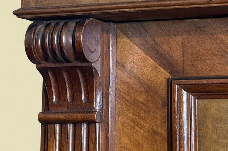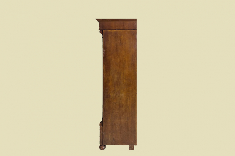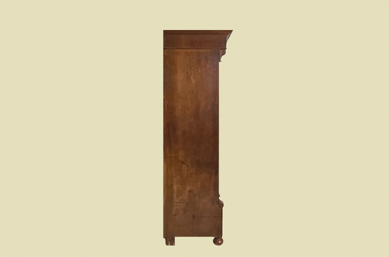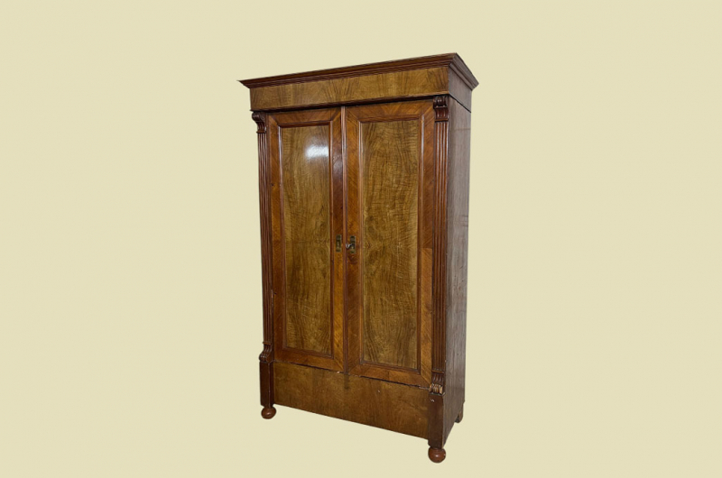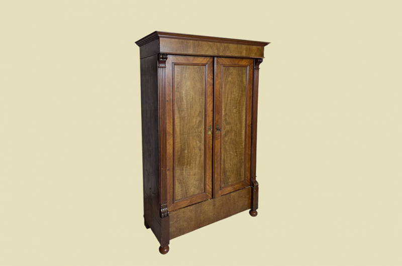 Hierbei handelt es sich um einen antiken Gründerzeit Kleiderschrank von 1880. Der antike Gründerzeit Kleiderschrank ist aus Nußbaum und hat eine Original Schellack Oberfläche. Neben den Türen des antiken Gründerzeit Kleiderschranks befinden sich gerillte Nußbaum Vollholz Leisten welche in geschnitzte Kapitäle übergehen. Die Türen sind fassettiert. Innerhalb der Türen befinden sich Original Nußbaum Wurzelholz Füllungen. Der antike Gründerzeit Kleiderschrank hat antike Messing Beschläge. Die Türen haben ein funktionierendes Schloss. Der antike Gründerzeit Kleiderschrank wird mit passendem Schlüssel ausgeliefert. Im inneren des antiken Gründerzeit Kleiderschranks befindet sich eine stabile Kleiderstange und ein Vollholz Regalbrett. Auf Wunsch können von uns optional weitere Regalbretter eingebaut werden (siehe Beispiel Fotos). Das Möbel kann mit 2 arretierbaren Riegeln zerlegt werden. So lassen sich Dach, Stange, Regalbrett, Rückwand und Türen demontieren. So kann der Schrank bequem mit nur 2 Personen durch enge Treppenhäuser oder in den "4. Stock" getragen werden. Der antike Gründerzeit Kleiderschrank steht auf stabilen gedrechselten Vollholz Füßen. Das Möbel hat auf jeden Fall eine ausgewogene Formgebung und ist ein Eye-Catcher in jeder gut situierten Wohnung. Das Möbel stammt aus einem tierfreien Nichtraucher Haushalt und ist in einem schönen wohnfertigen Zustand.