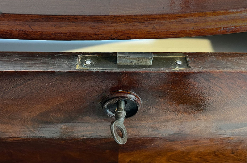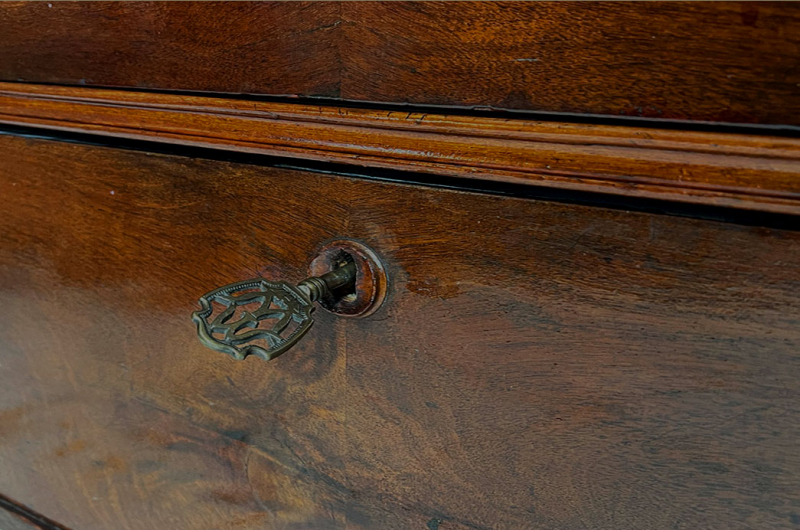 Hierbei handelt es sich um ein antike Louis Philippe Kommode von 1840. Die antike Louis Philippe Kommode ist aus Mahagoni und hat eine Schellack Oberfläche. Die obere Deckplatte ist typisch im Louis Phillip geformt. Die antike Kommode hat 3 Schubladen. An den Schubladen befinden sich 3 Schlüssel die zum aufziehen dienen. Die Kommode hat 3 Schlösser. Die Beschläge sind aus antikem Holz. Die Deckplatte ist typisch im Louis Phillip Stil geformt. Darunter befindet sich leichtgängig zu öffnende Schubladen. Die Schubladen haben eine handgefertigte Schwalbenschwanzverbindung. Die antike Louis Philippe Kommode hat reichlich Stauraum. Die antike Kommode hat eine durchgängige Holzmaserung von der obersten Schublade bis nach unten. Links und rechts neben den Schubladen befinden sich Vollholz Leisten welche in geschnitzte Kapitäle übergehen. Die antike Louis Philippe Kommode steht auf stabilen gedrechselten Vollholz Füßen. Das Möbel hat eine ausgewogene Formgebung und ist ein Eye-Catcher in jeder gut situierten Wohnung. Das Möbel stammt aus einem tierfreien Nichtraucher Haushalt und ist in einem schönen wohnfertigen Zustand.