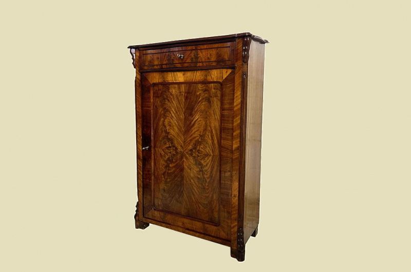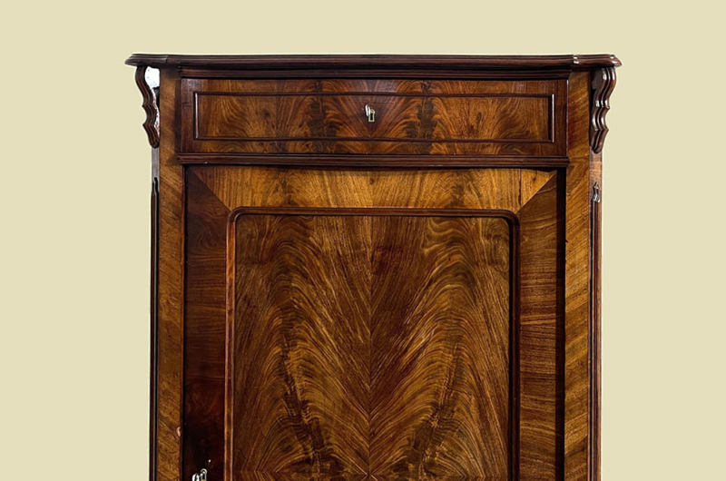 Hierbei handelt es sich um ein antikes Louis Philippe Vertiko von 1840. Das antike Louis Philippe Vertiko ist aus Nußbaum und hat eine Original Schellack Oberfläche. Links und rechts neben der Türe befinden sich Vollholz Leisten welche in geschnitzte Kapitäle über gehen. Die Türe des antiken Louis Philippe Vertikos ist kassettiert. In den Türfüllungen befinden sich gespiegeltes Nußbaum Wurzelholz. Das Louis Philippe Vertiko hat antike Messing Beschläge. Die Türen und Schublade des antiken Louis Philippe Vertikos sind abschließbar und werden mit 2 passenden Schlüsseln ausgeliefert. Die obere Platte der antike Louis Philippe Kommode ist typischen Louis Philippe geformt. Die Schublade ist aus Vollholz und leichtgängig zu öffnen. Im inneren des antiken Louis Philippe Vertikos befinden sich 4 stabile Vollholz Regalbretter. Die Regalbretter können heraus genommen werden. Die Regalbretter sind auf höhen verstellbaren Zahnleisten gelagert. Das Vertiko steht auf stabilen Louis Philippe Vollholz Füßen. Auf jeden Fall hat das Möbel eine ausgewogene Formgebung und ist ein Eye-Catcher in jeder gut situierten Wohnung. Das Möbel stammt aus einem tierfreien Nichtraucher Haushalt und ist in einem schönen wohnfertigen Zustand. Die Ordner und Aufsatz sind nur ein Beispiel und gehören nicht zum Angebot.