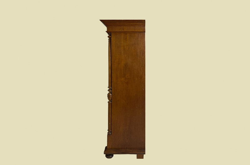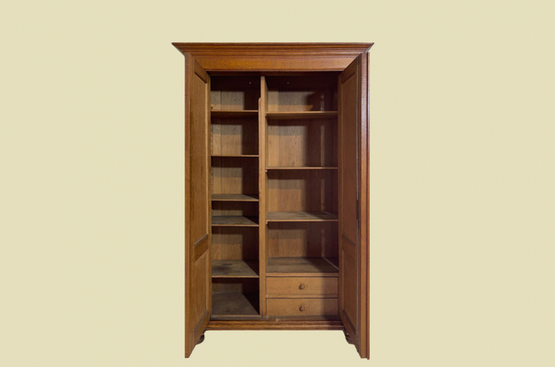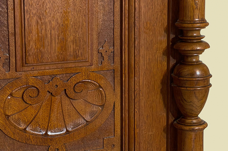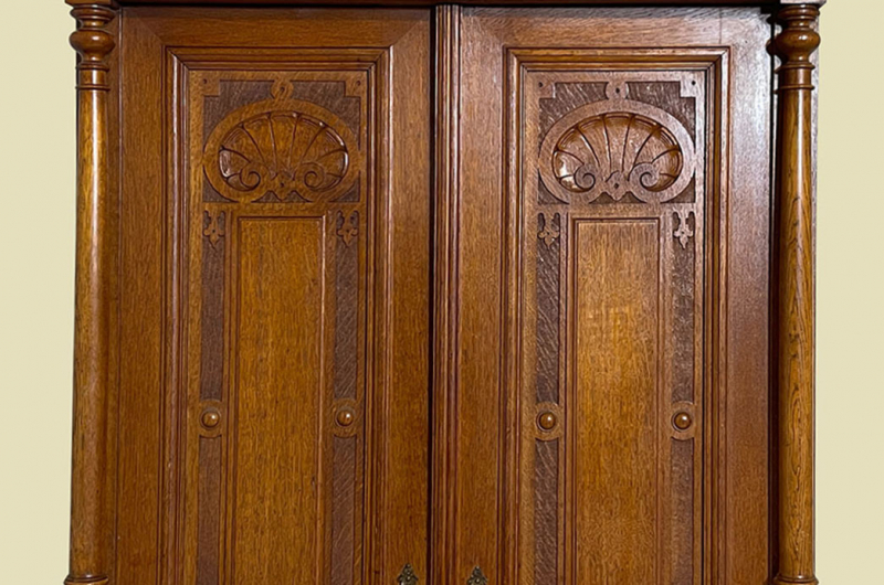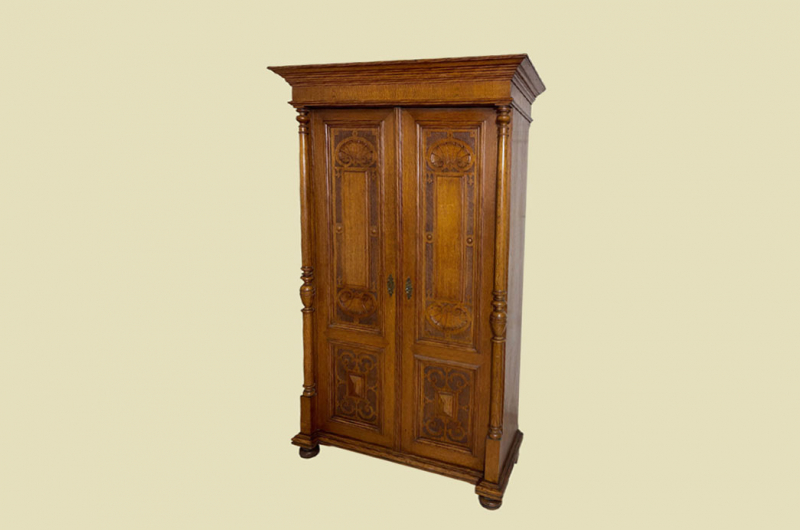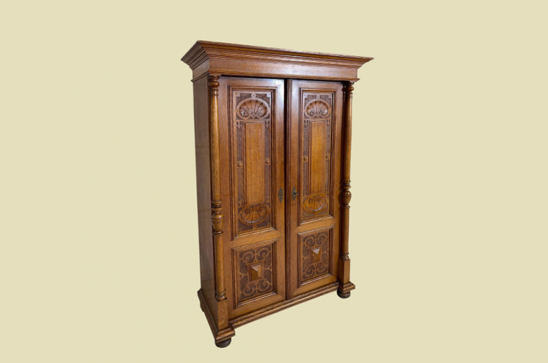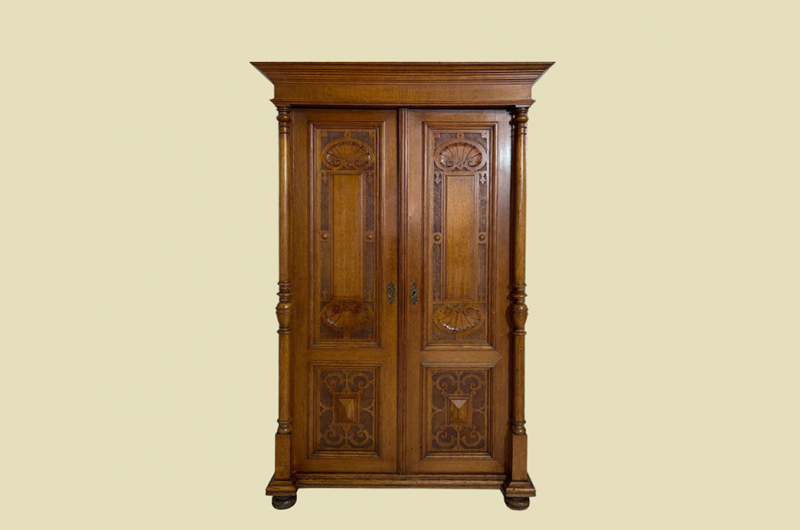 Hierbei handelt es sich um einen antiken Gründerzeit Kleiderschrank von 1880. Der antike Gründerzeit Kleiderschrank ist aus Eiche und hat eine Original Schellack Oberfläche. Neben den Türen des antiken Gründerzeit Kleiderschranks befinden sich gedrechselte Vollholz Säulen welche in geschnitzte Kapitäle übergehen. Die Türen sind fassettiert. Innerhalb der Türen befinden sich geschnitzte Füllungen. Der antike Gründerzeit Kleiderschrank hat antike Messing Beschläge. Die Türen haben ein funktionierendes Schloss. Der antike Gründerzeit Kleiderschrank wird mit passendem Schlüssel ausgeliefert. Im inneren des antiken Gründerzeit Kleiderschranks befindet sich Vollholz Regalbretter und 2 Schubladen. Die Regalbretter sind auf höhen verstellbaren Zahnleisten gelagert. Auf Wunsch kann von uns optional kostenlos rechts eine Stange eingebaut werden (siehe Beispiel Fotos). Der antike Gründerzeit Kleiderschrank steht auf stabilen gedrechselten Vollholz Füßen. Das Möbel hat auf jeden Fall eine ausgewogene Formgebung und ist ein Eye-Catcher in jeder gut situierten Wohnung. Das Möbel stammt aus einem tierfreien Nichtraucher Haushalt und ist in einem schönen wohnfertigen Zustand.