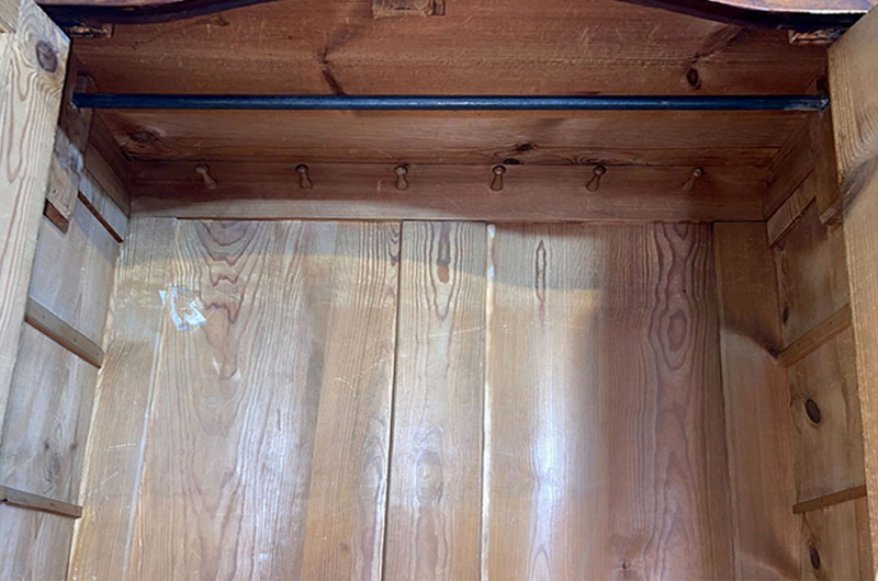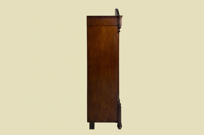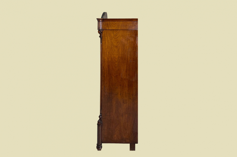 Hierbei handelt es sich um einen antiken Louis Philippe Schrank von 1840. Der Schrank Ist aus Nußbaum und hat eine Original Schellack Oberfläche. Die Türen sind fassettiert. Links und rechts neben den Türen befinden sich Vollholz Leisten welche in geschnitzte Kapitäle übergehen. Innerhalb der Türe befinden sich schöne Nußbaum Wurzelholz Füllungen. Oberhalb befindet sich ein eine dezente gut erhaltenen Bekrönung. Die Türen haben ein funktionierendes Schloss. Der antike Louis Philippe Schrank wird mit passendem Schlüssel ausgeliefert. Im inneren des antiken Louis Philippe Schranks befindet sich eine Kleiderstange und Kleiderhaken. Auf Wunsch können von uns optional Regalbretter eingebaut werden (siehe Beispiel Fotos). Der antike Louis Philippe Schrank steht auf typischen Louis Philippe Vollholz Füßen. Das Möbel kann mit nur 2 Holzriegeln zerlegt werden. So lassen sich Dach, Stange, Rückwand und Türen demontieren. So kann der Schrank bequem mit nur 2 Personen durch enge Treppenhäuser oder in den "4. Stock" getragen werden. Das Möbel hat auf jeden Fall eine ausgewogene Formgebung und ist ein Eye-Catcher in jeder gut situierten Wohnung. Das Möbel stammt aus einem tierfreien Nichtraucher Haushalt und ist in einem schönen wohnfertigen Zustand.
