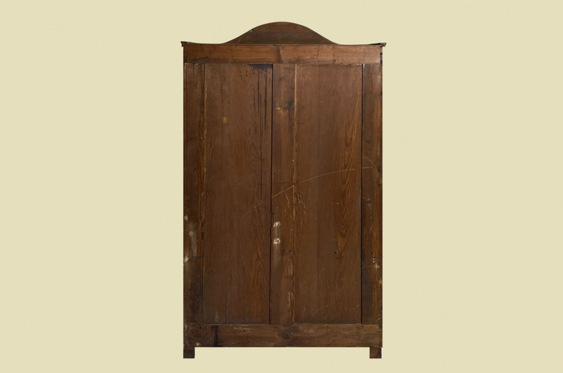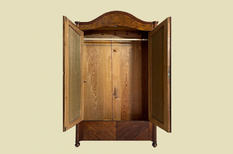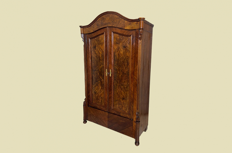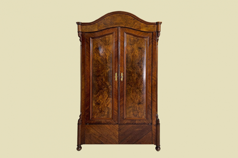 Hierbei handelt es sich um einen antiken Louis Philippe Schrank von 1840. Der Schrank Ist aus Nußbaum und hat eine Original Schellack Oberfläche. Die Türen sind fassettiert. Links und rechts neben den Türen befinden sich Vollholz Leisten welche in geschnitzte Kapitäle übergehen. Innerhalb der Türe befinden sich schöne Nußbaum Wurzelholz Füllungen. Oberhalb befindet sich ein eine dezente gut erhaltenen Bekrönung. Die Türen haben ein funktionierendes Schloss. Der antike Louis Philippe Schrank wird mit passendem Schlüssel ausgeliefert. Im inneren des antiken Louis Philippe Schranks befindet sich eine Kleiderstange und Kleiderhaken. Auf Wunsch können von uns optional Regalbretter eingebaut werden (siehe Beispiel Fotos). Der antike Louis Philippe Schrank steht auf typischen Louis Philippe Vollholz Füßen. Das Möbel kann mit nur 2 Holzriegeln zerlegt werden. So lassen sich Dach, Stange, Rückwand und Türen demontieren. So kann der Schrank bequem mit nur 2 Personen durch enge Treppenhäuser oder in den "4. Stock" getragen werden. Das Möbel hat auf jeden Fall eine ausgewogene Formgebung und ist ein Eye-Catcher in jeder gut situierten Wohnung. Das Möbel stammt aus einem tierfreien Nichtraucher Haushalt und ist in einem schönen wohnfertigen Zustand.