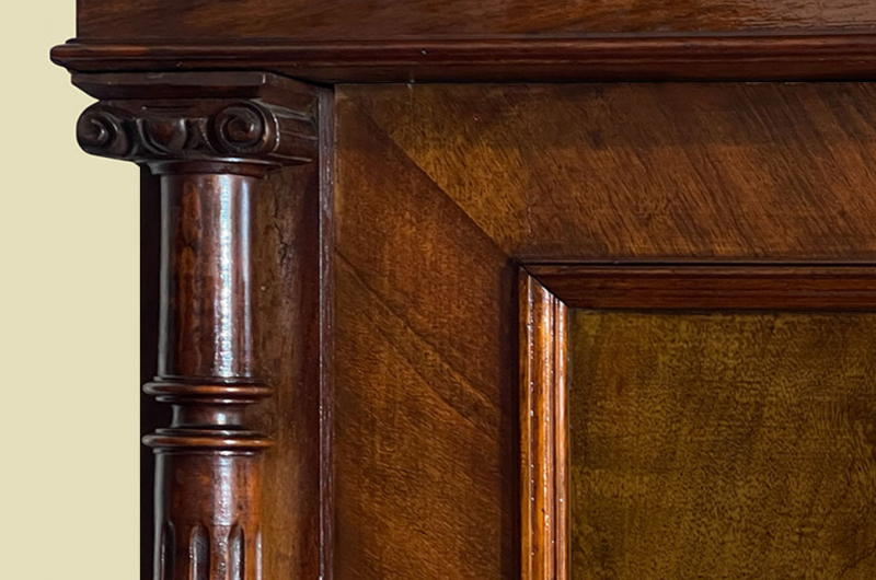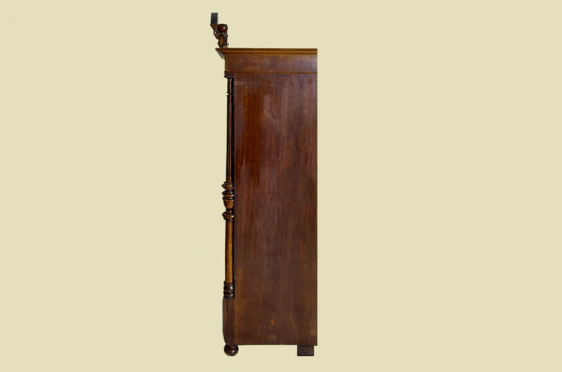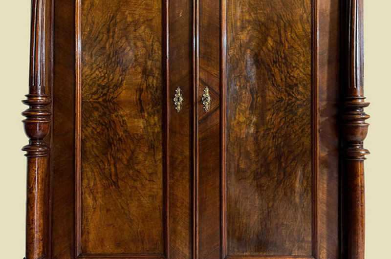 Hierbei handelt es sich um einen antiken Gründerzeit Kleiderschrank von 1880. Der antike Gründerzeit Kleiderschrank ist aus Nußbaum und hat eine Original Schellack Oberfläche. Neben den Türen des antiken Gründerzeit Kleiderschranks befinden sich gedrechselte Nußbaum Vollholz Säulen welche in geschnitzte Kapitäle übergehen. Die Türen sind fassettiert. Innerhalb der Türen befinden sich Original Wurzelholz Nußbaum Füllungen. Oberhalb befindet sich noch die Original Muschel Bekrönung. Die Bekrönung kann für den Transport abgemacht werden. Der antike Gründerzeit Kleiderschrank hat antike Messing Beschläge. Die Türen haben ein funktionierendes Schloss. Der antike Gründerzeit Kleiderschrank wird mit passendem Schlüssel ausgeliefert. Im inneren des antiken Gründerzeit Kleiderschranks befindet sich eine stabile Kleiderstange und Kleiderhaken. Auf Wunsch können von uns optional Regalbretter eingebaut werden (siehe Beispiel Fotos). Das Möbel kann mit 2 Holzriegeln zerlegt werden. So lassen sich Dach, Stange und Türen demontieren. So kann der Schrank bequem mit nur 2 Personen durch enge Treppenhäuser oder in den "4. Stock" getragen werden.Der antike Gründerzeit Kleiderschrank steht auf stabilen gedrechselten Vollholz Füßen. Das Möbel hat auf jeden Fall eine ausgewogene Formgebung und ist ein Eye-Catcher in jeder gut situierten Wohnung. Das Möbel stammt aus einem tierfreien Nichtraucher Haushalt und ist in einem schönen wohnfertigen Zustand.