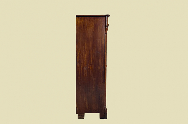 Hierbei handelt es sich um ein antikes Louis Philippe Vertiko von 1840. Das antike Louis Philippe Vertiko ist aus Mahagoni und hat eine Original Schellack Oberfläche. Links und rechts neben der Türe befinden sich Vollholz Leisten welche in geschnitzte Kapitäle über gehen. Die Türe des antiken Louis Philippe Vertikos ist kassettiert. In den Türfüllungen befinden sich gespiegeltes Pyramiden Mahagoni. Das Louis Philippe Vertiko hat antike Holz Griffe. Die obere Platte der antike Louis Philippe Kommode ist typischen Louis Philippe geformt. Die Schublade ist aus Vollholz und leichtgängig zu öffnen. Im inneren des antiken Louis Philippe Vertikos befinden sich 3 stabile Vollholz Regalbretter. Die Regalbretter können heraus genommen werden. Der Innenraum ist Tief genug um Akten Ordner unter zu bringen. Das Vertiko steht auf stabilen Louis Philippe Vollholz Füßen. Auf jeden Fall hat das Möbel eine ausgewogene Formgebung und ist ein Eye-Catcher in jeder gut situierten Wohnung. Das Möbel stammt aus einem tierfreien Nichtraucher Haushalt und ist in einem schönen wohnfertigen Zustand.