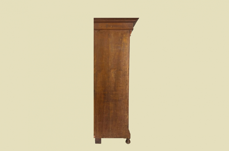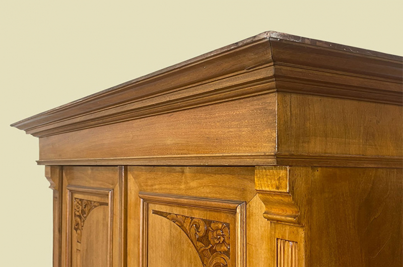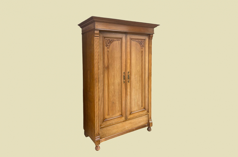 Hierbei handelt es sich um einen antiken Jugendstil Schrank von 1920. Der Schrank hat Bügeltiefe. Der antike Jugendstil Schrank ist aus Kirschholz und hat eine Original Schellack Oberfläche. Links und recht neben den Türen befinden sich Vollholz Leisten welche in geschnitzte Kapitäle übergehen. Der antike Jugendstil Schrank hat schöne antike Jugendstil Messing Beschläge. Die Türen haben ein funktionierendes Schloss und sind abschließbar. Der antike Jugendstil Schrank wird mit passendem Schlüssel ausgeliefert. Die Türen sind fassettiert. In den Türen sind - wie der Jugendstil Künstler Gustav Klimt in seinen Bildern des öfteren verwendet hat - florale Lebensbaum Elemente. Im Inneren des antiken Jugendstil Schranks befinden sich eine praktische Einteilung mit Kleiderstange und Vollholz Regalbretter. Das Möbel kann mit nur 2 arretierbaren Holzriegeln zerlegt werden. So lassen sich Dach, Stange, Regalbretter und Türen demontieren. So kann der Schrank bequem mit nur 2 Personen durch enge Treppenhäuser oder in den "4. Stock" getragen werden. Das Möbel hat auf jeden Fall eine ausgewogene Formgebung und ist ein Eye-Catcher in jeder gut situierten Wohnung. Das Möbel stammt aus einem tierfreien Nichtraucher Haushalt und ist in einem schönen wohnfertigen Zustand.